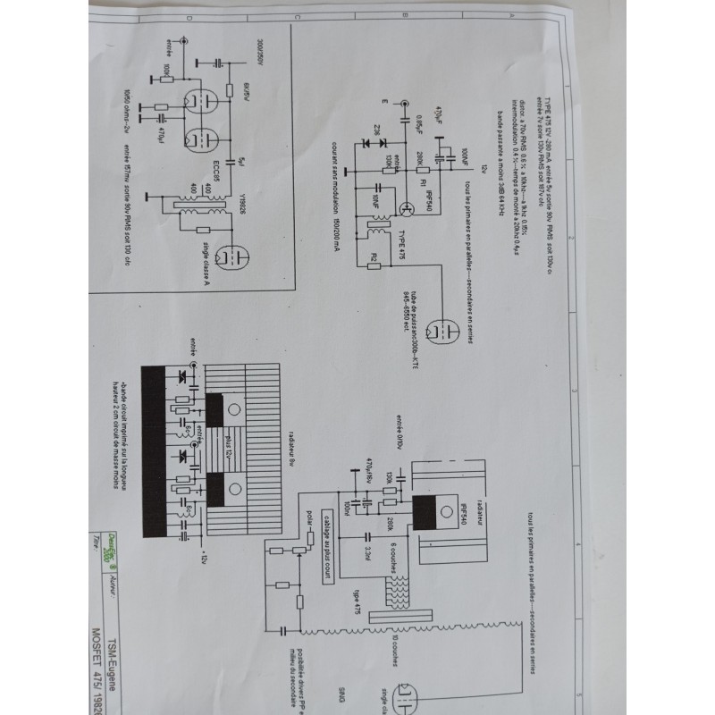 sortie a Très basse impédance, évite tous les courants grille du tube final ( vielles triodes) , exemple, entrée 3 volts RMS sortie 66v RMS, soit 95v c/c, sortie symétrique permet de driver 2 tubes en PP, le niveau en volts est identique et le déphasage est parfait. Schéma électrique du mos fet est fourni.